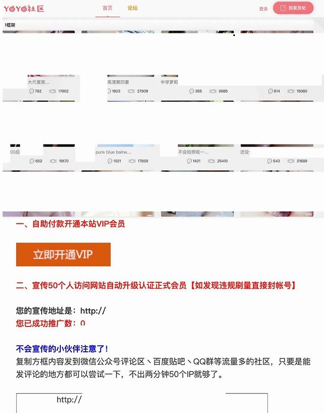 除却 128 元起的 VIP 标售, YOYO 社区更对每名访问者单设宣传地址,配以「萝莉」「公主」等字眼,号召推广至微信公号评论区,百度贴吧及 Q 群等。